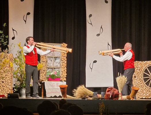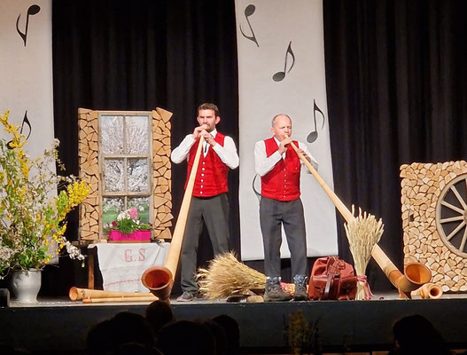 Das Alphornduo Sunneberg gab abwechselnd einige schöne Melodien auf dem Alphorn und dem Büchel zum Besten.